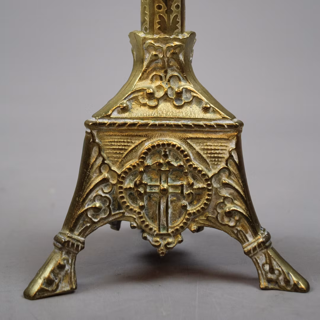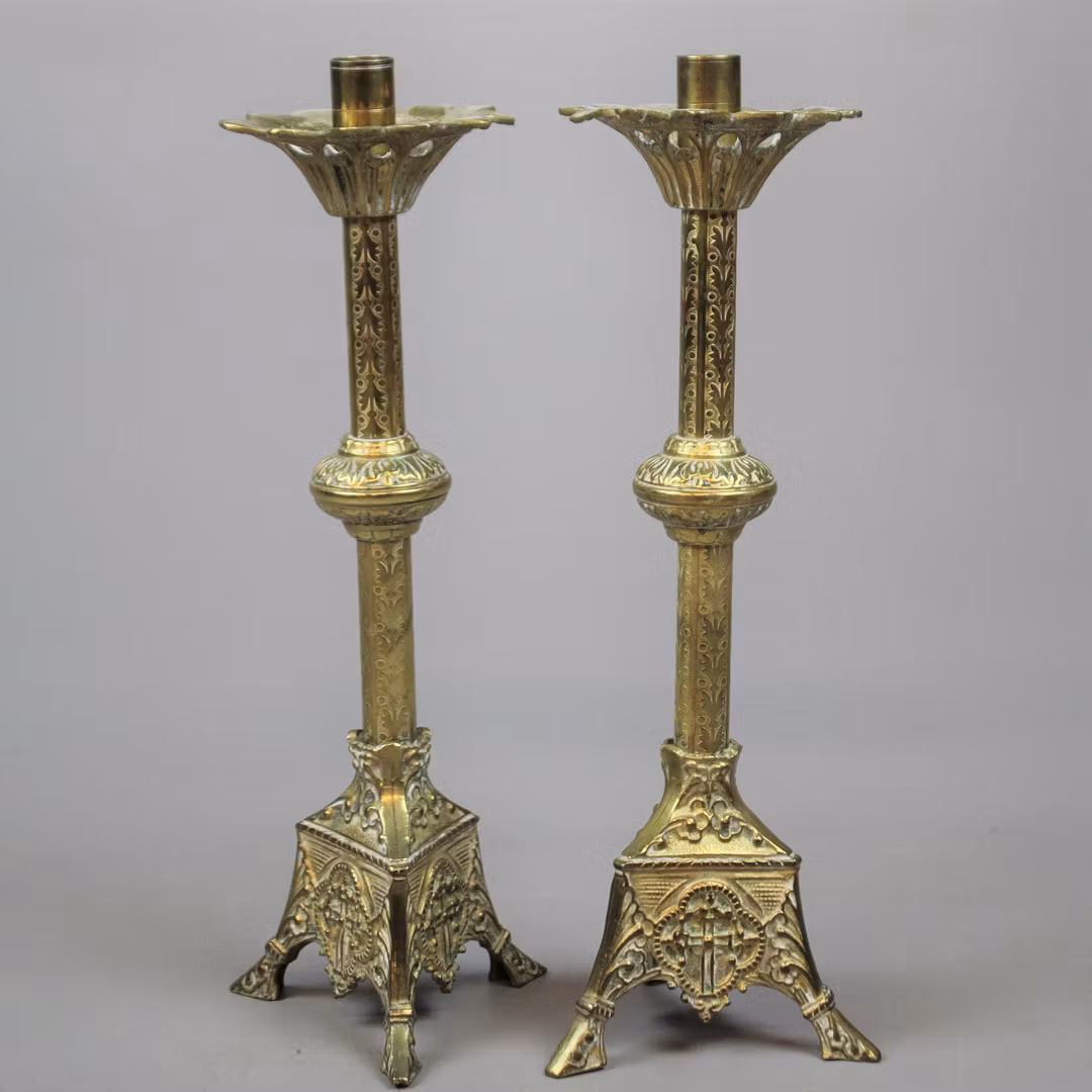 Vackra högresta kyrkoljusstakar i mässing, plats för vanliga kronljus eller antikljus.Höjd: 34cmAvhämtas i södra Ängelholm eller levereras hem, kan ev. också skickas med paket, tag kontakt på [email protected] för fraktkostnad.