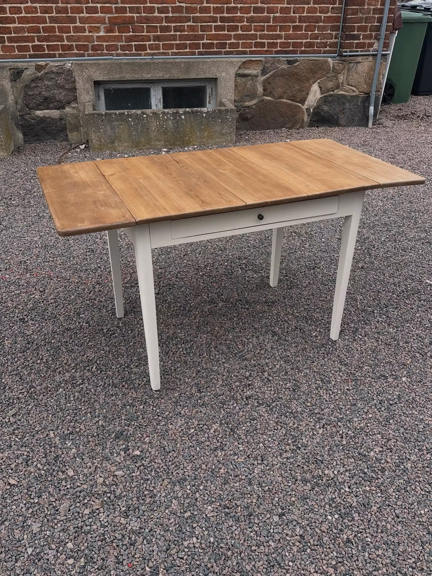 Vackert litet klaffbord med vaxad toppskiva och målat underrede (kulör "Raw Silk" från Fusion Mineral Paint).