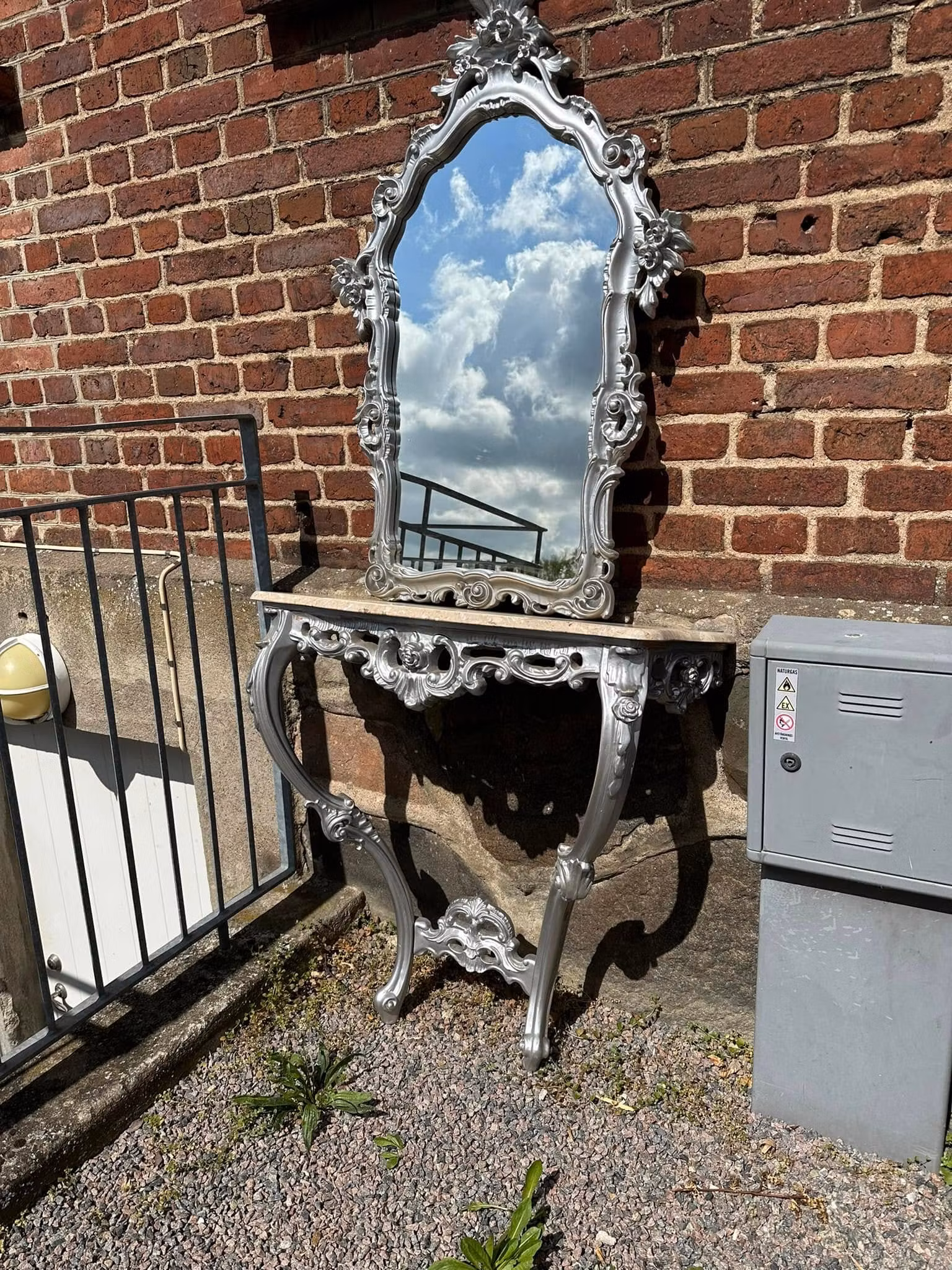Kolsolbord med ljus stenskiva samt tillhörande spegel, samtida.Avhämtning i södra Ängelholm eller hemleverans, tag kontakt på [email protected] för fraktkostnad.
