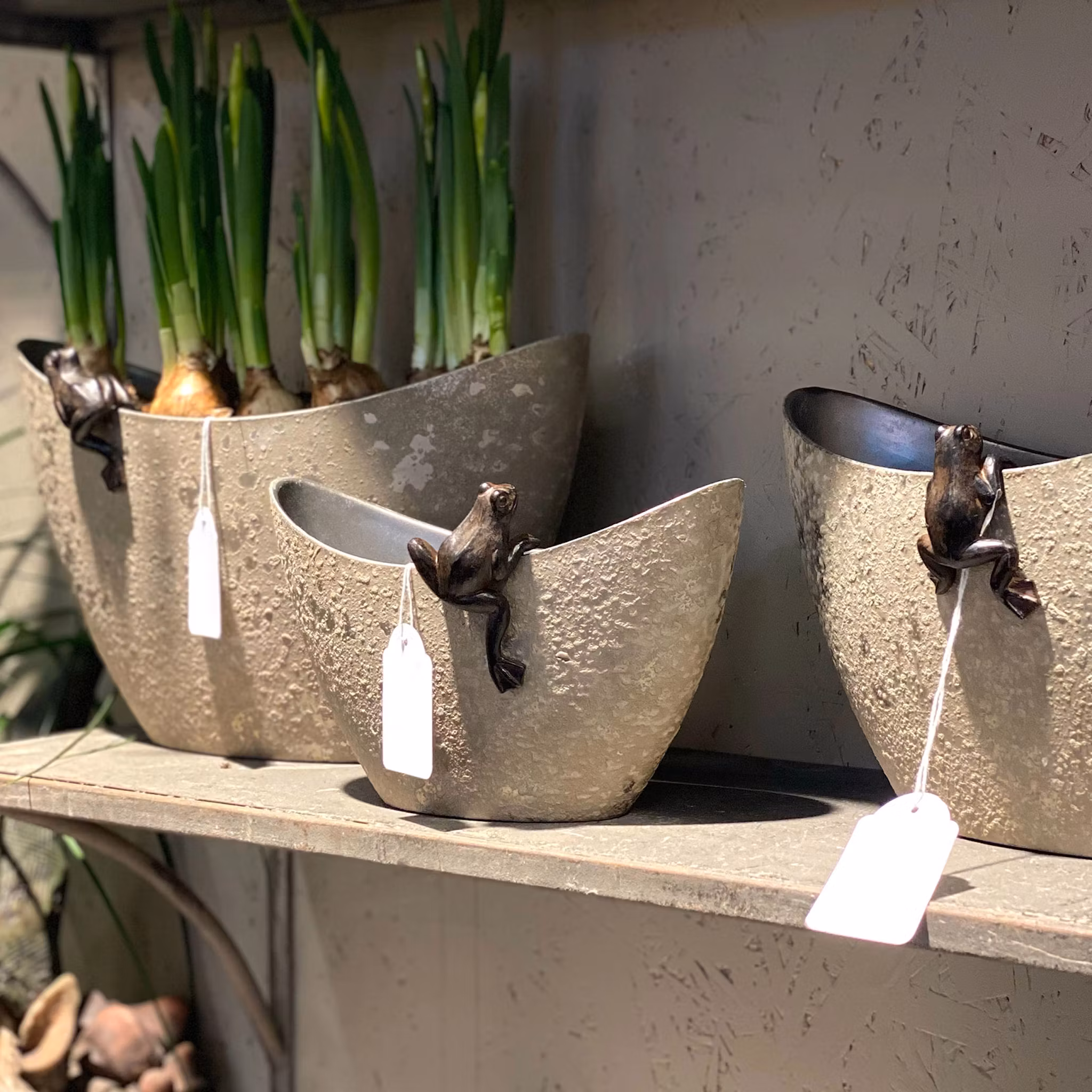 Lekfulla grodor som kan hängas på en blomkruka eller vas. Tillverkade av poly.