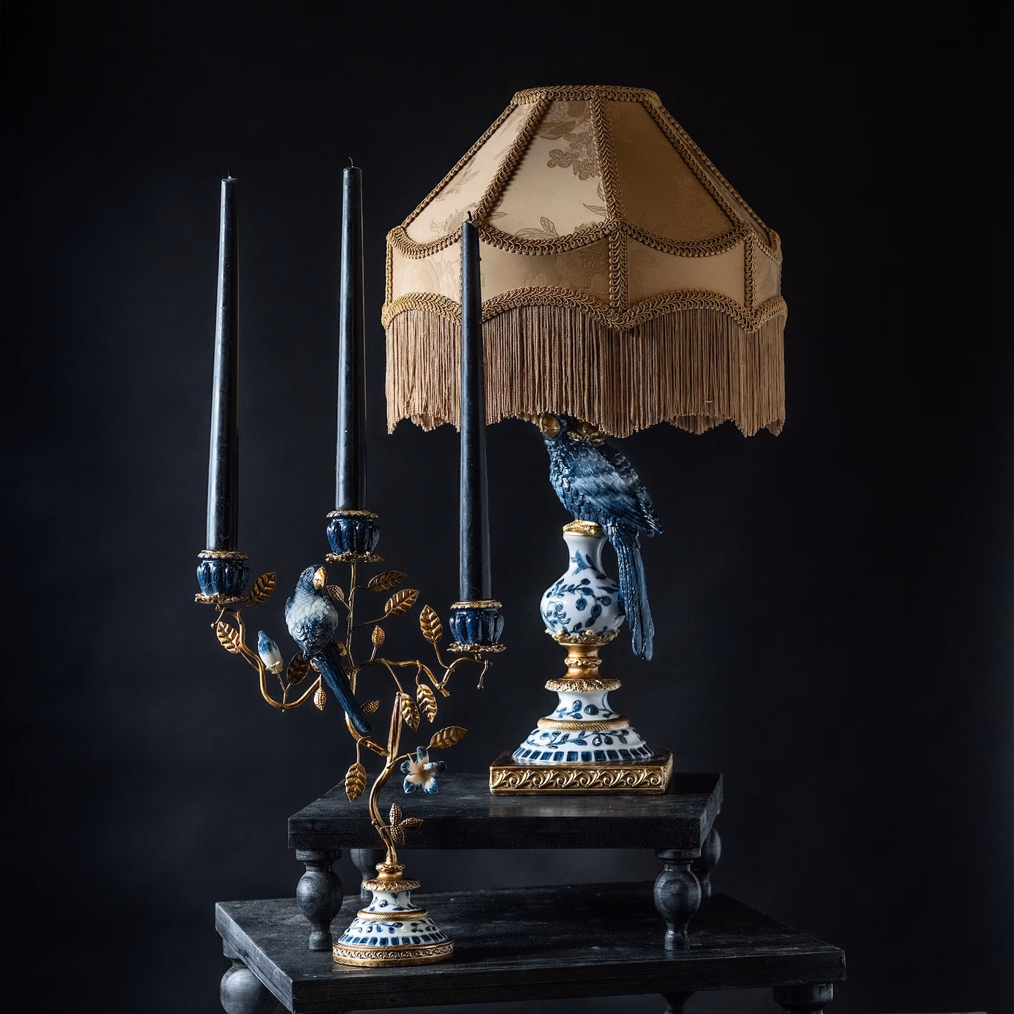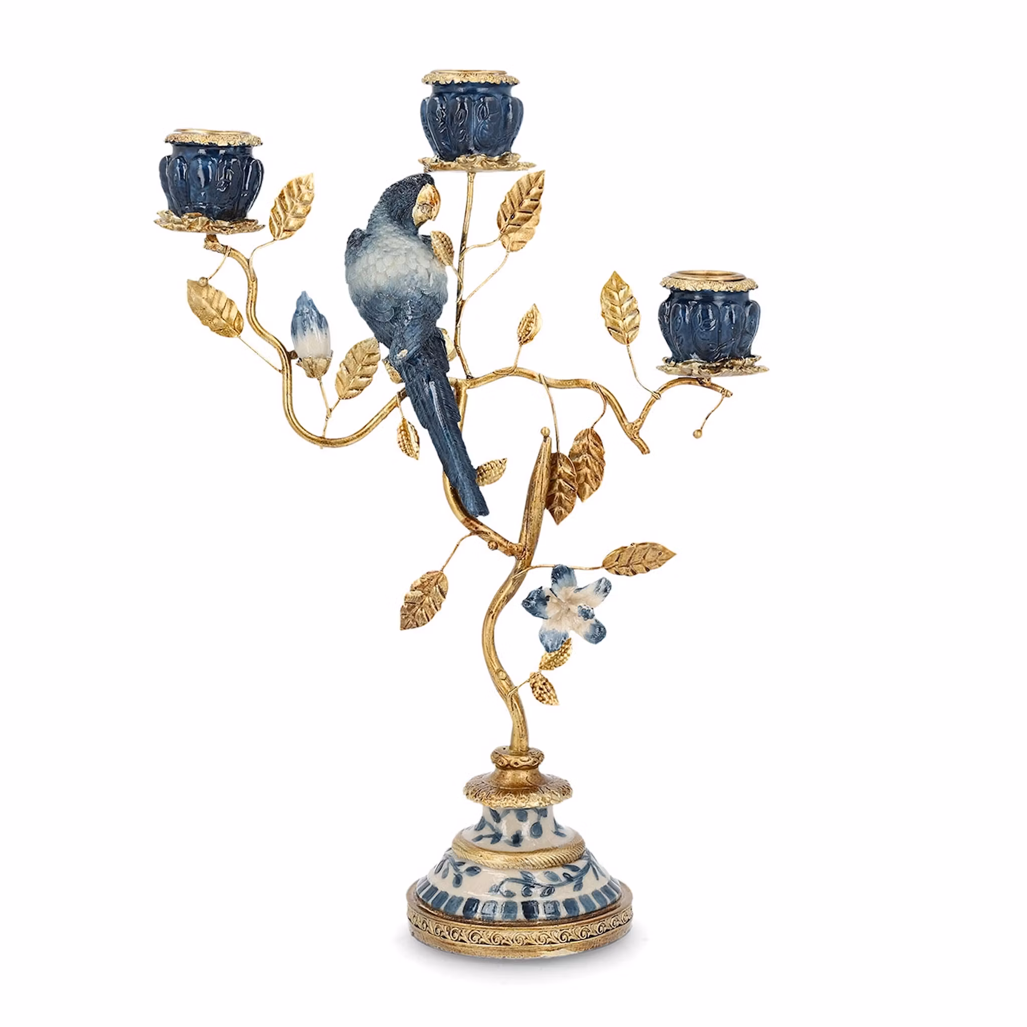 Vacker ljusstake i blått, vitt och guld. Med tre ljushållare för kronljus.Höjd: 32cm