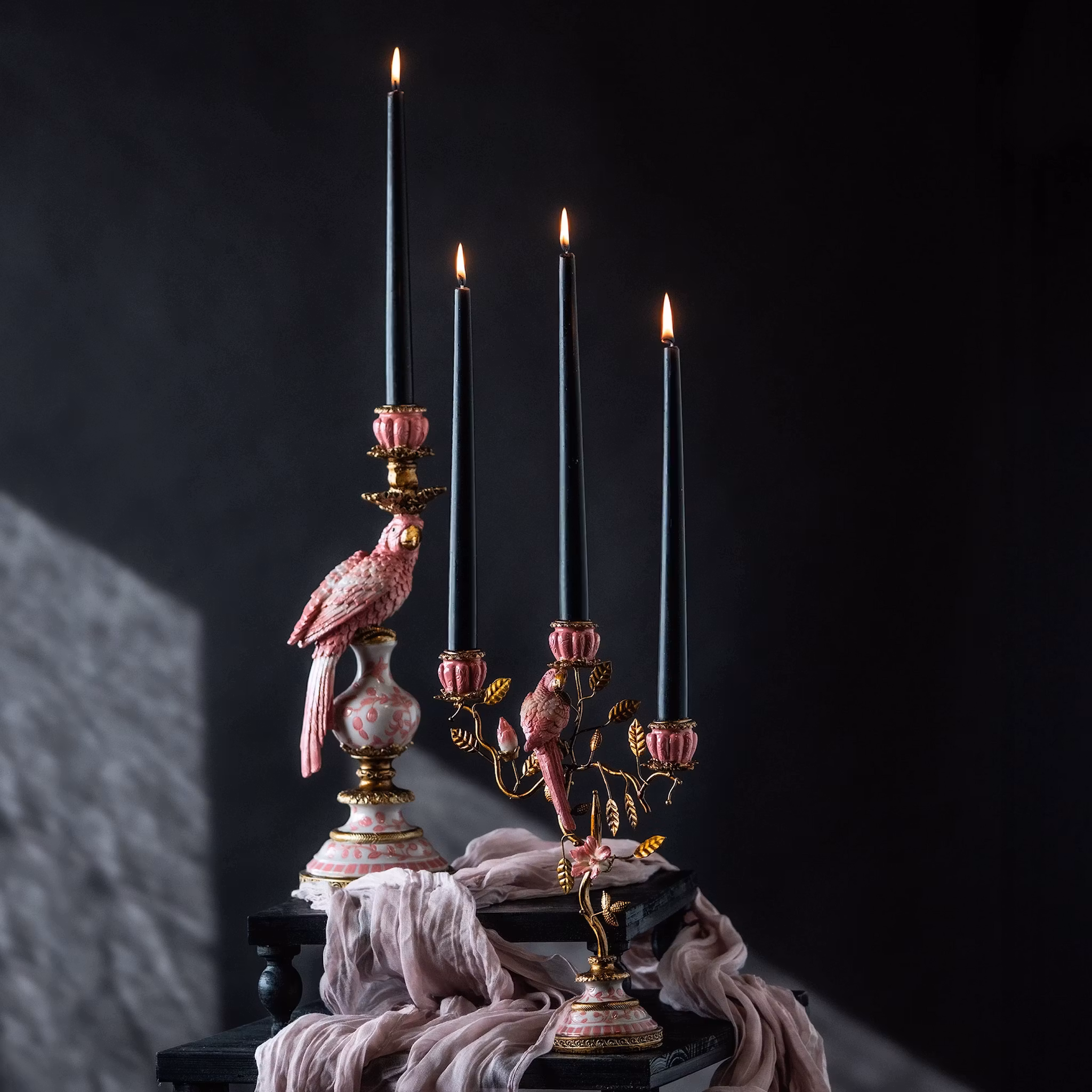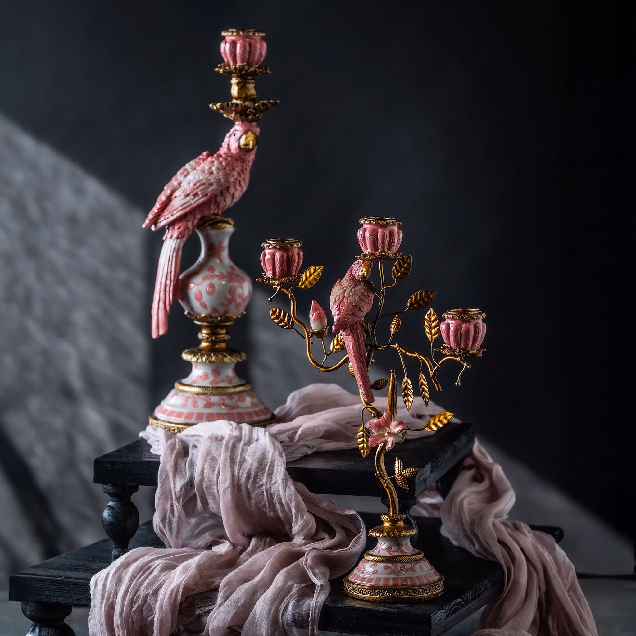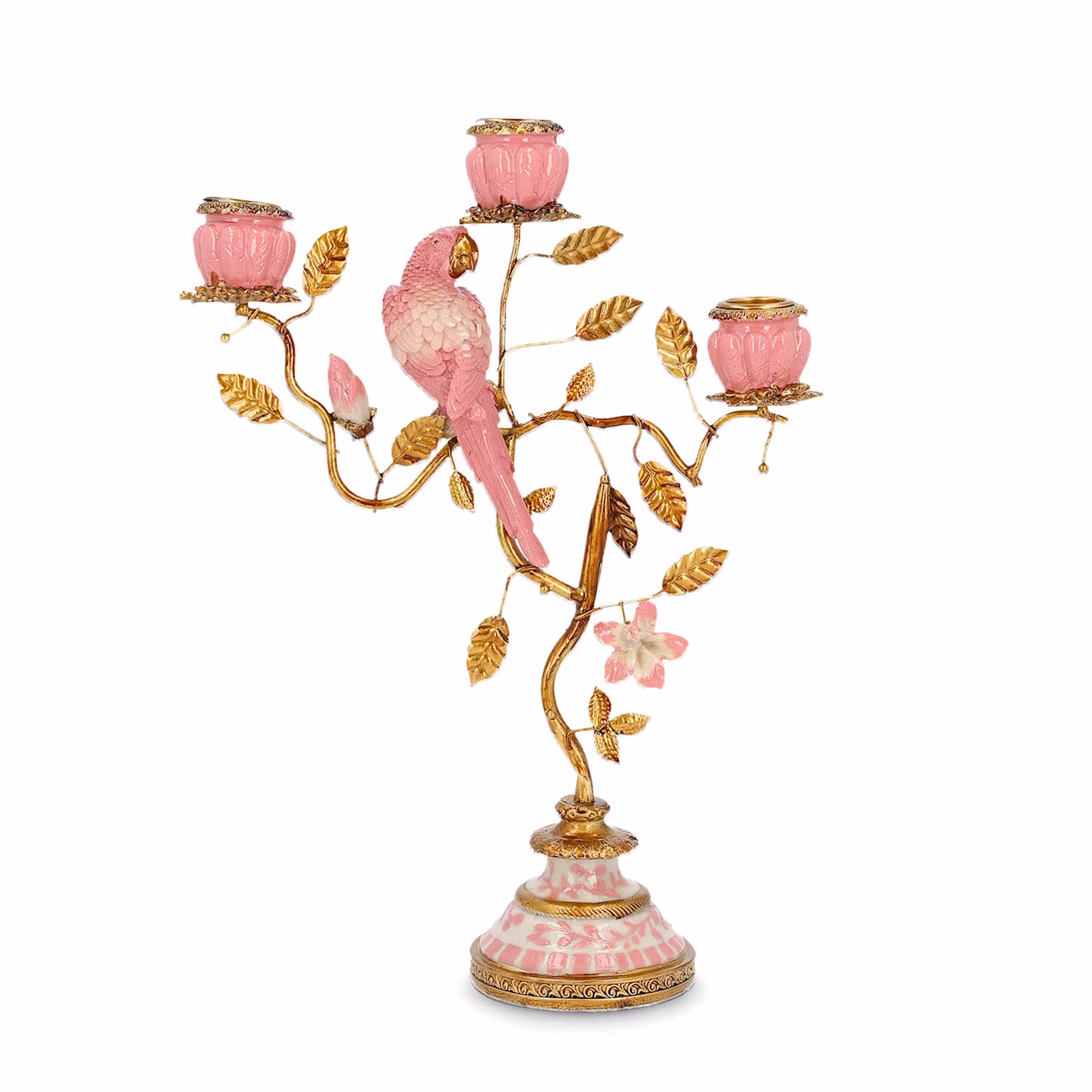 Vacker ljusstake i rosa, vitt och guld. Med tre ljushållare för kronljus.Höjd: 32cm