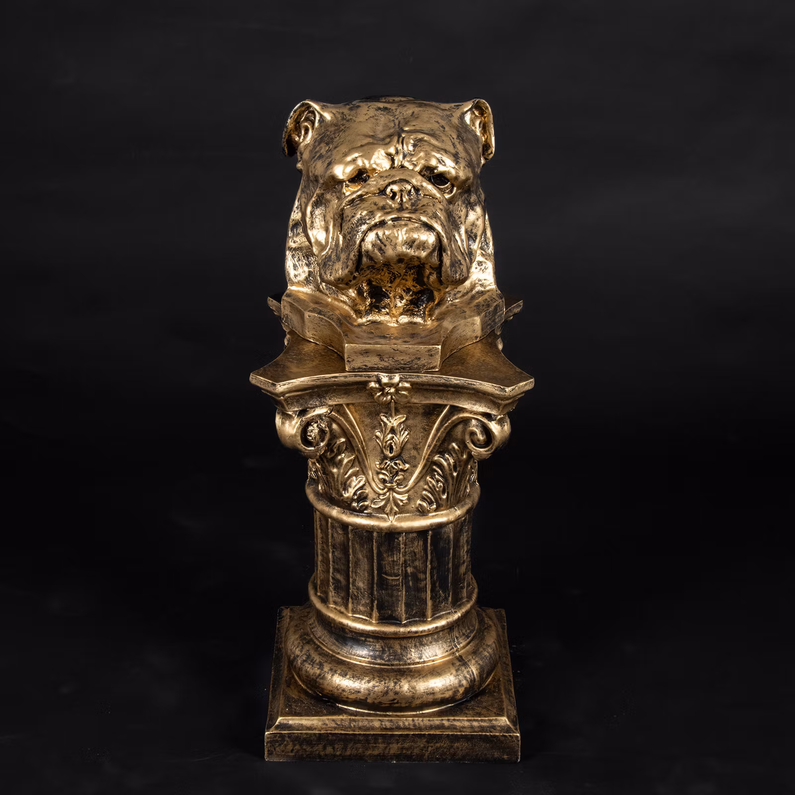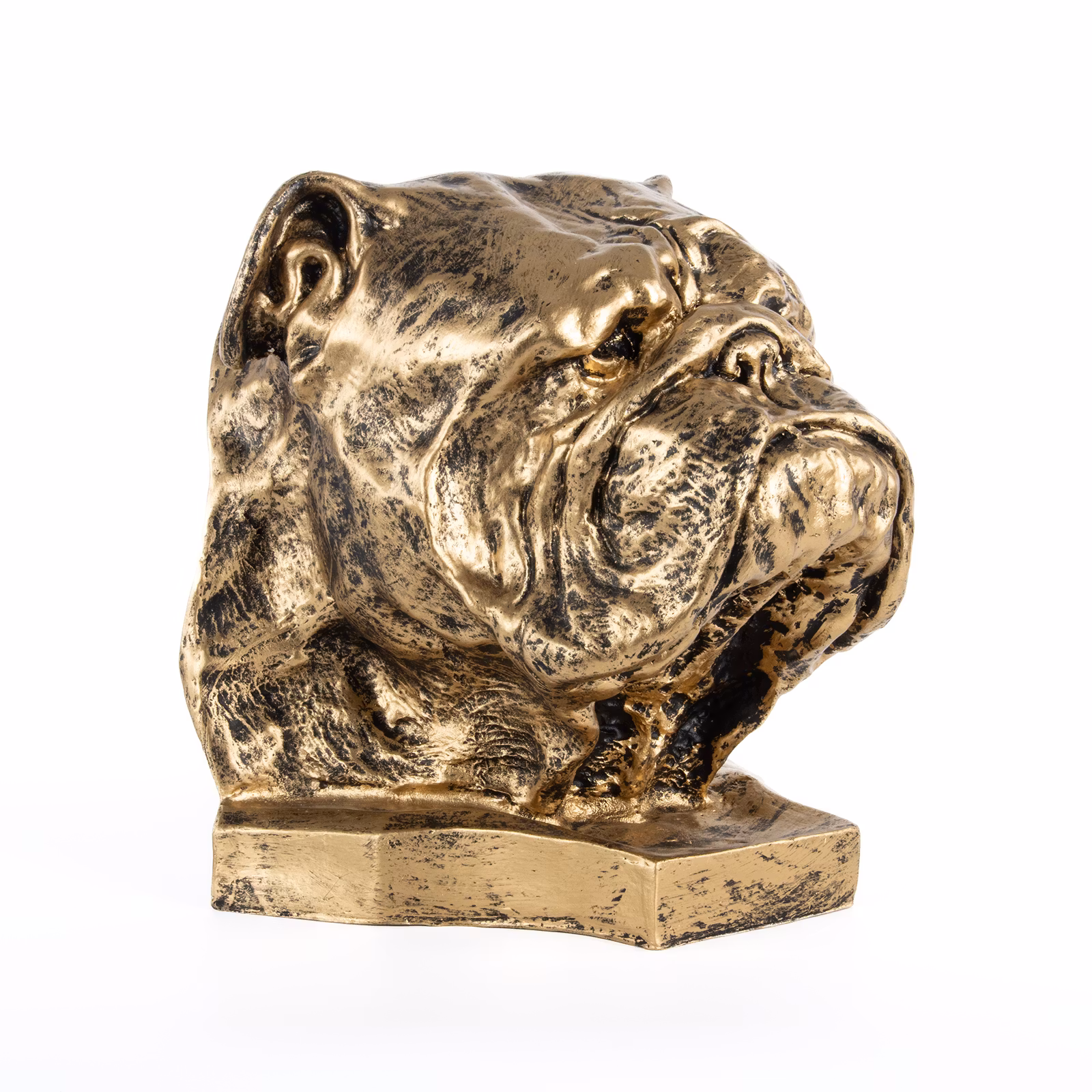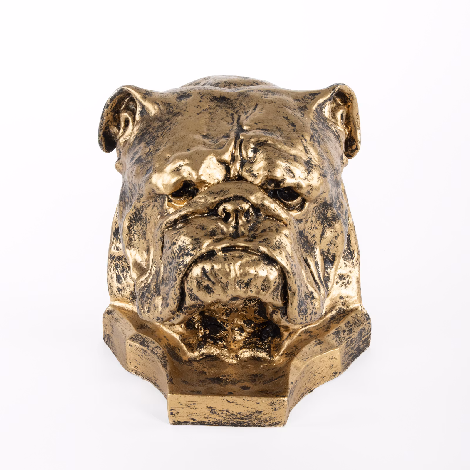 Större skulptur i polyresin av ett bulldoggshuvud i guld.