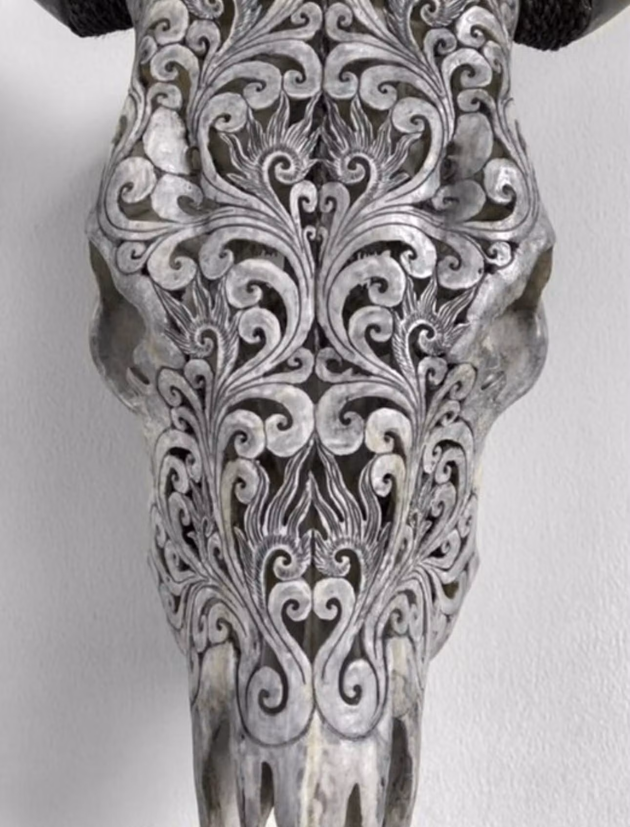 Äkta buffelskalle, handsnidad med vackert mönster.