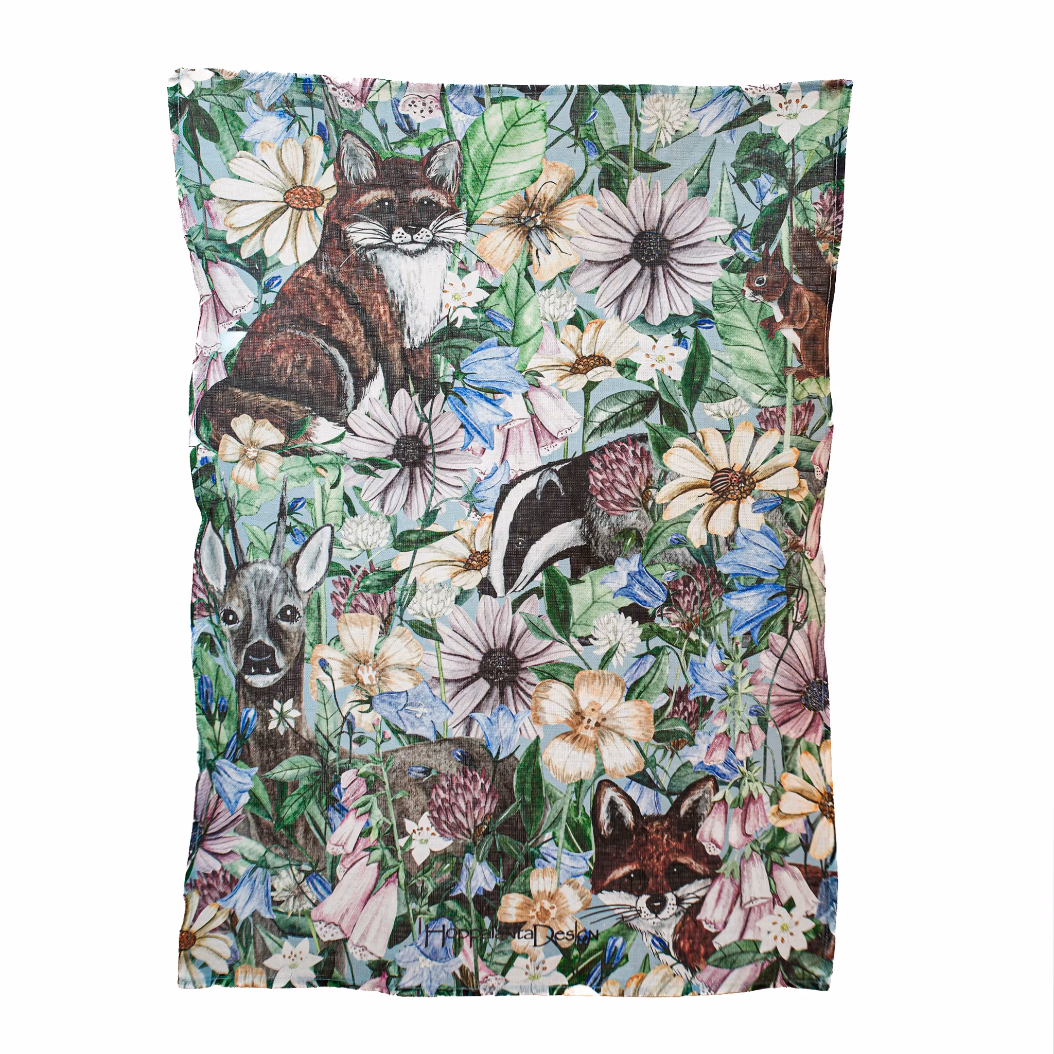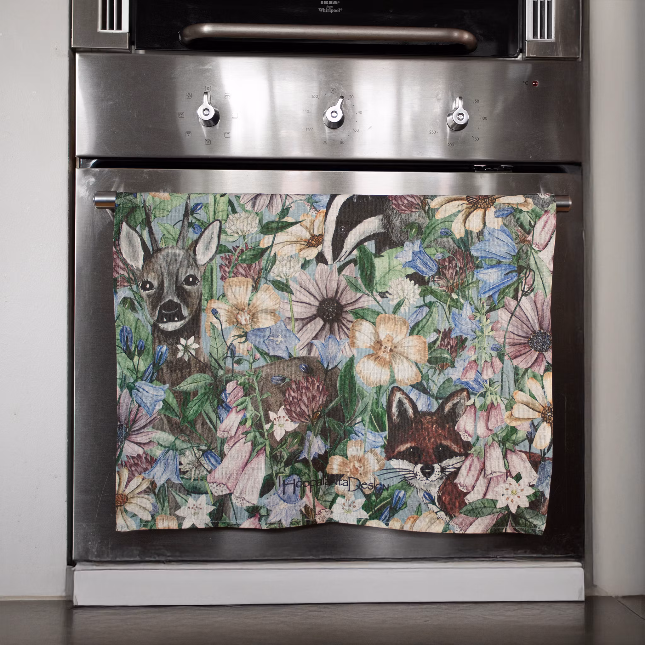 Kökshandduk, Happy Forest 50×68 cmKökshandduk i 100% linne.Tvättas i 30° ök.Mönsterdesign av Åsa-Pia Andersson, Hoppalanta Design.